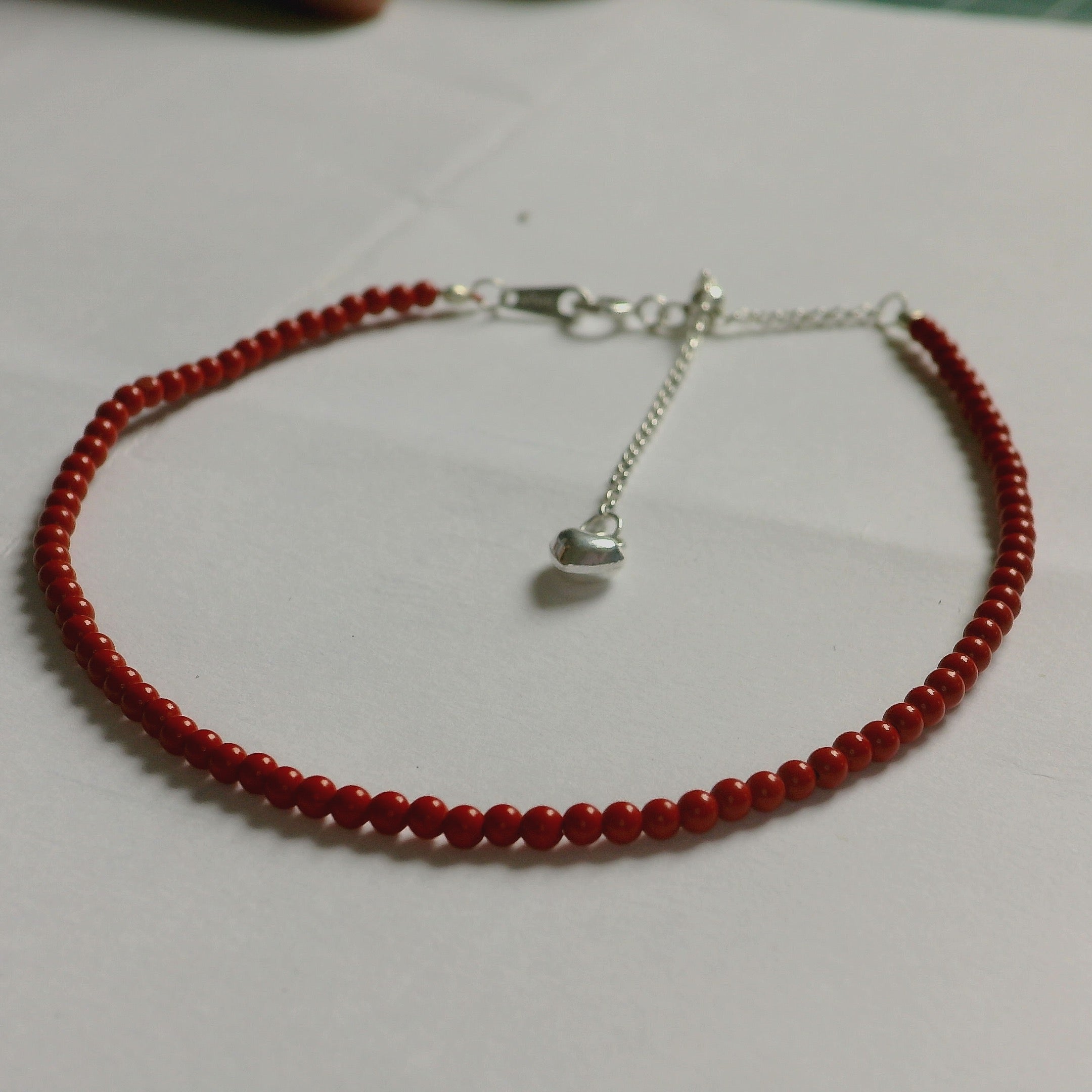 Elevate your style with this dainty silver beaded bracelet. It features meticulously strung, round cabochon-cut coral beads of a vibrant red hue. The bracelet is crafted with attention to detail, exuding elegance and charm. Perfect for adding a touch of sophistication to any ensemble.