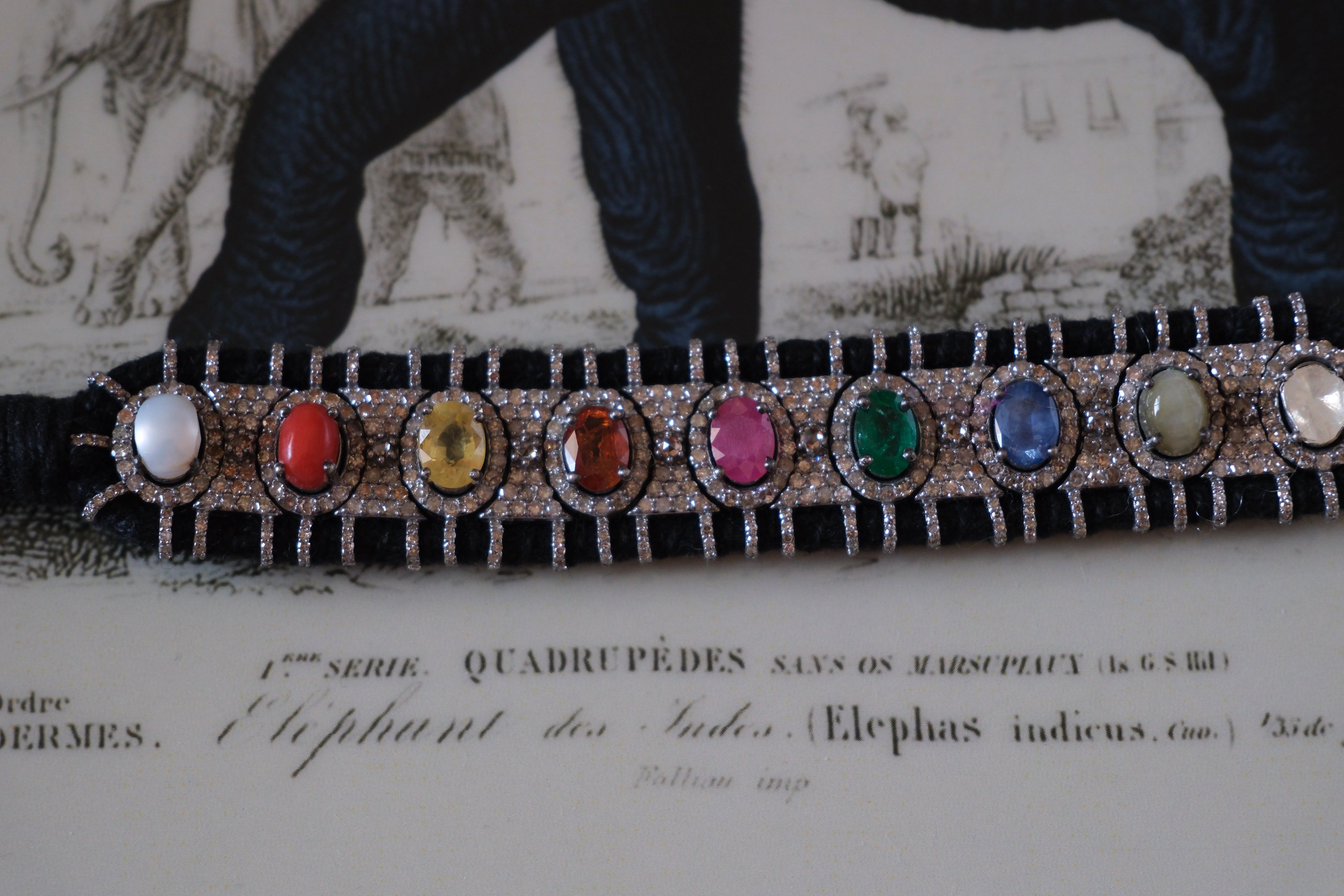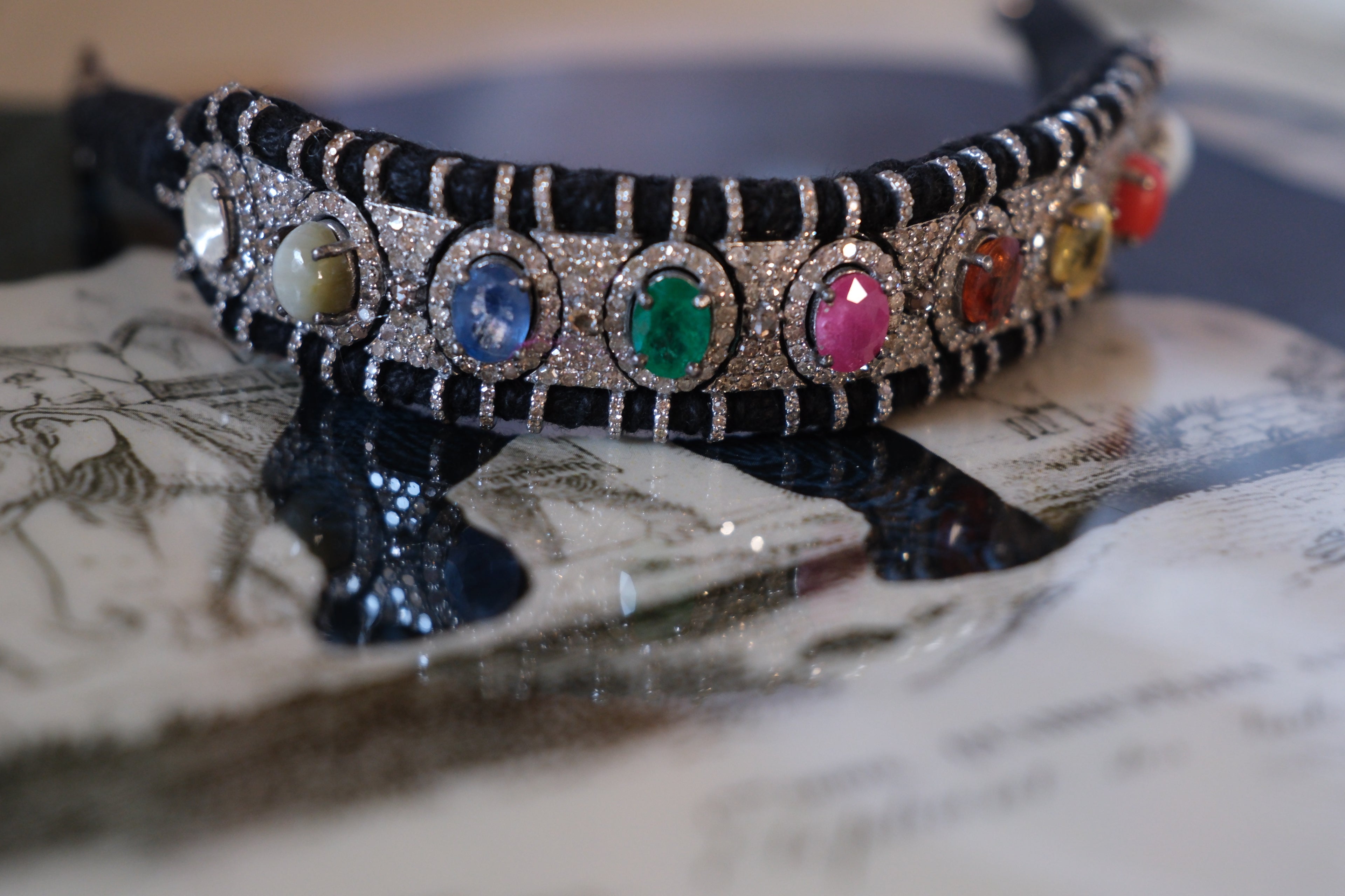 Handcrafted with precision, the oval-cut gems — Ruby, Pearl, Red Coral, Emerald, Yellow Sapphire, Diamond, Blue Sapphire, Hessonite, and Cat’s Eye — are set in a vintage-inspired diamond frame, woven onto a rich black cord that evokes the structured elegance of the Deco era.